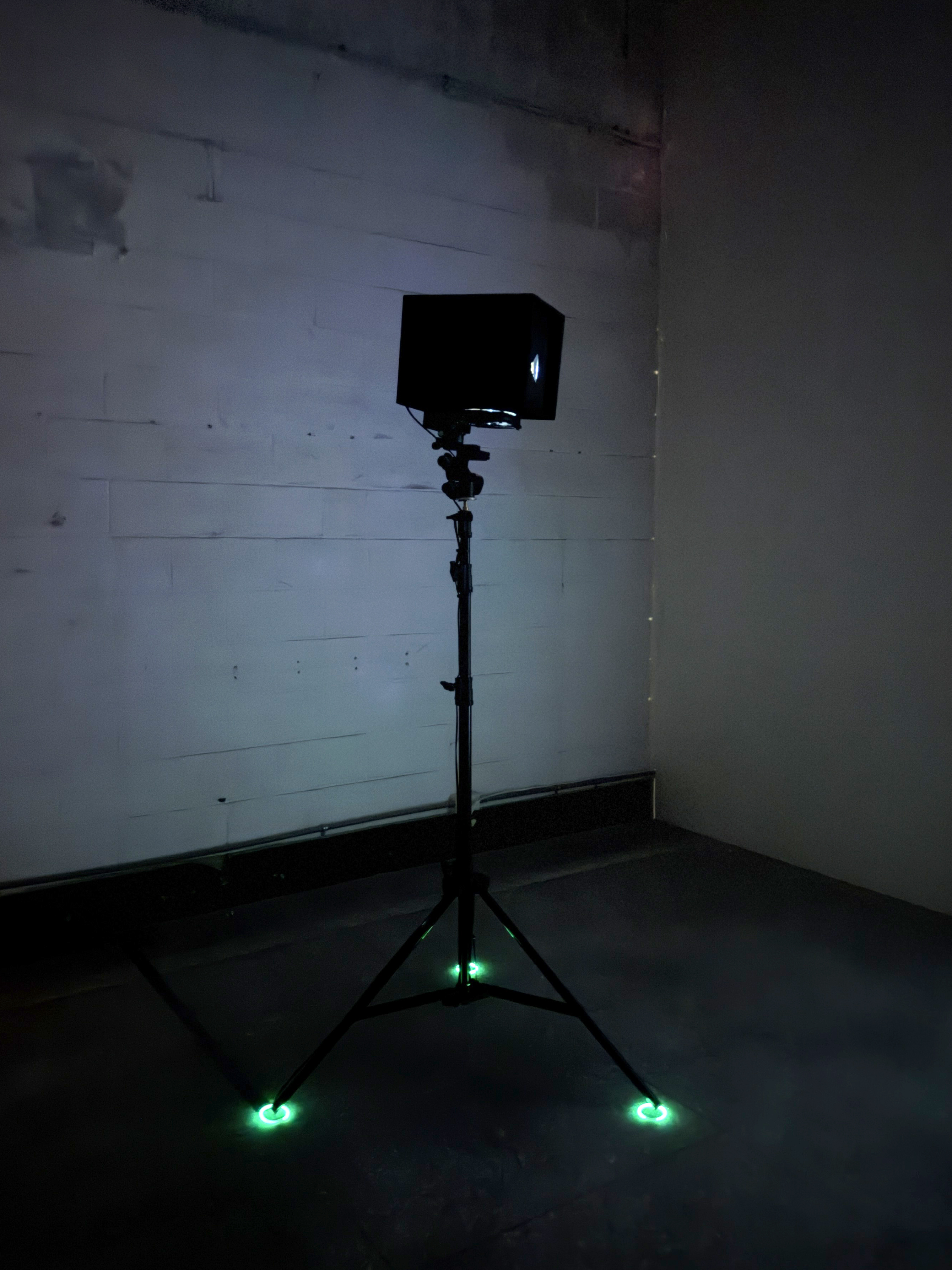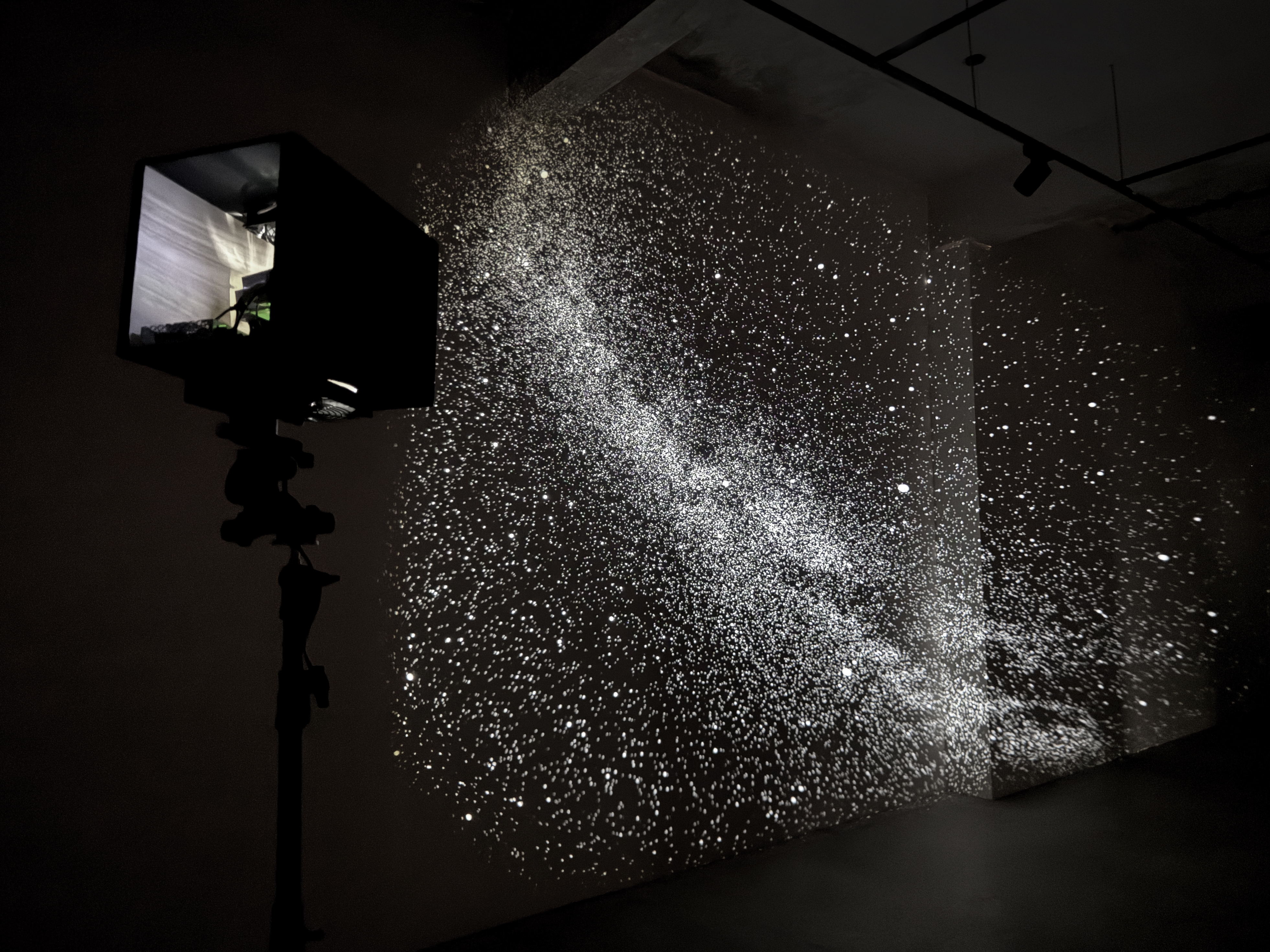 The artist projects a star-field onto wall surfaces set at different angles. As the stars move at a constant speed across the projection, their apparent motion sharply changes when crossing the corner, creating a perceptual distortion. Through this visual fold, the work imagines and responds to humanity’s compressed, sliced understanding of the vast scales of the universe.