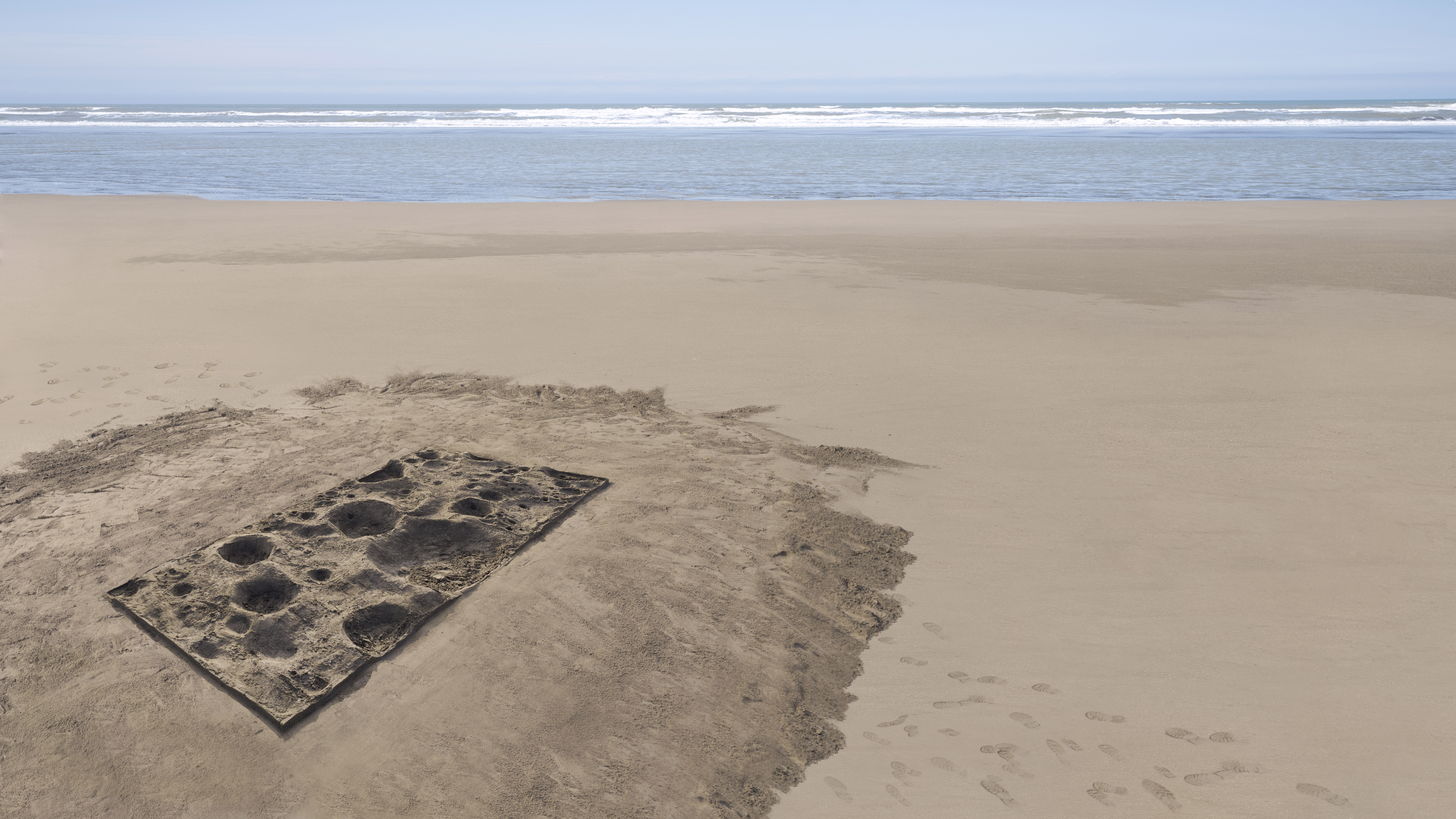 With the beach probably being the least intervened scenery on earth, I artificially recreated the texture of the moon on the sand to reflect the lunar surface which was on the other hand naturally formed. I created a sand sculpture by the sand on the beach to imitate the natural textures of the lunar surface. The appearance of the sculpture is like the texture used in 3D modeling. The moon texture seems to map to our beach, mirroring the moon in the sky. (On-site Scale: 6 meters by length, 2.5 meters by width)