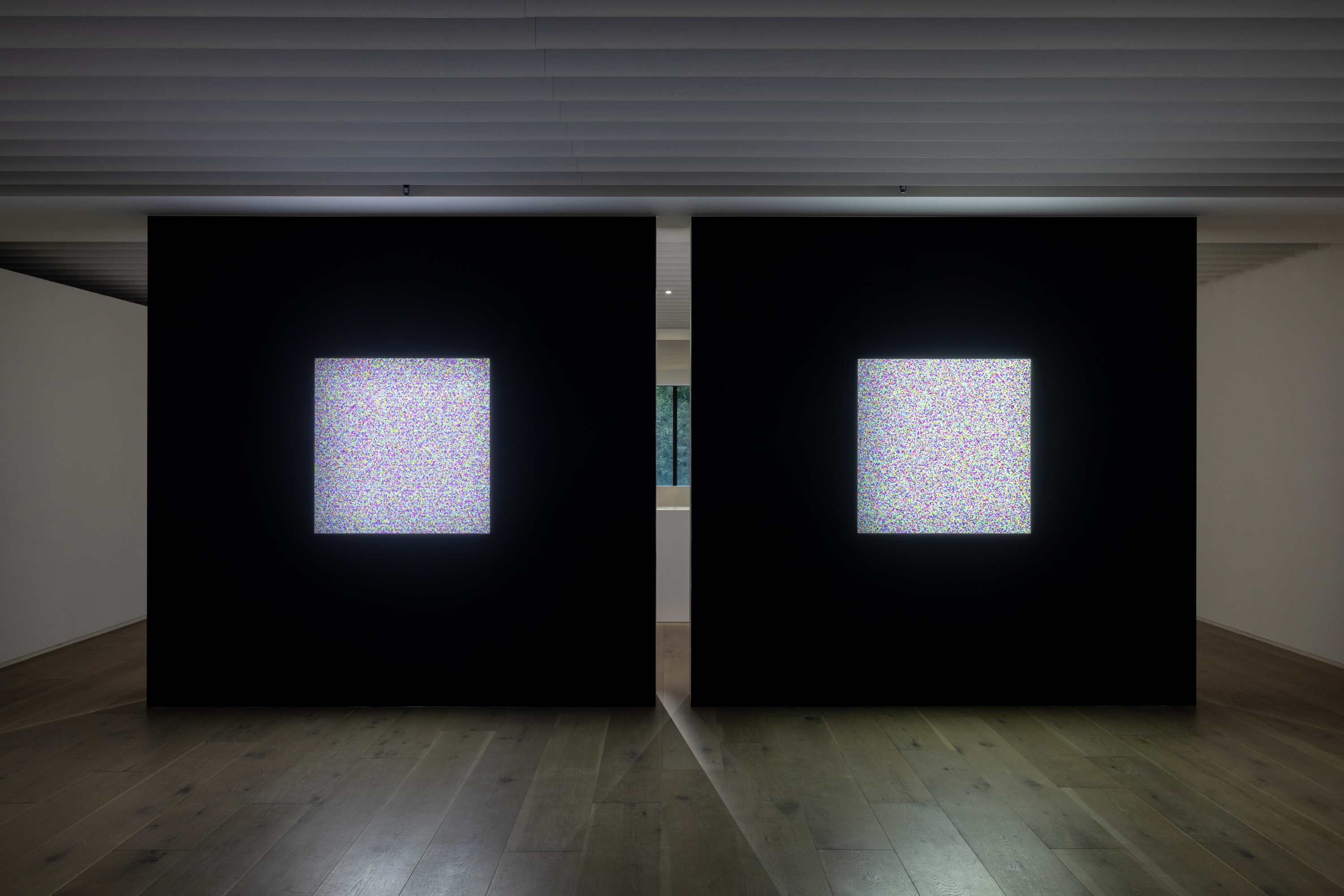 The “crowdsourced labeling” and “Google search entries” in Inter net - Labeling me use the technology of text embedding to convert these textual descriptions of the artists into eigenvectors before converting the eigenvectors again into color blocks that are arranged into matrix based on a chronological order. The textual descriptions that are more similar in terms of semantics will produce blocks of more similar colors. These seemingly random noise images in fact reveal the distribution of the artists’ descriptions of “I.” As time progresses, the descriptions of “I” also become fluid and different, and the color distribution changes accordingly.
