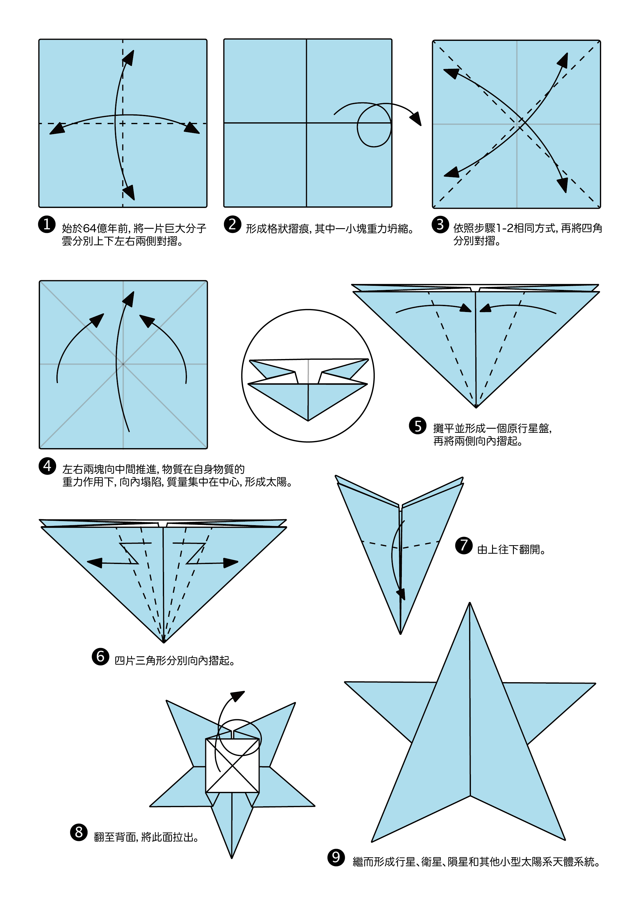 工作桌面上的物件,是我認知世界的狀態。我將《暗淡藍點》的影像摺成各種紙星星造型,並繪製摺紙教學的圖文,在教學的語句中加入自己的想像與觀點。並透過一些科學影像的拼貼,試圖理解科學如何重構我的認知。